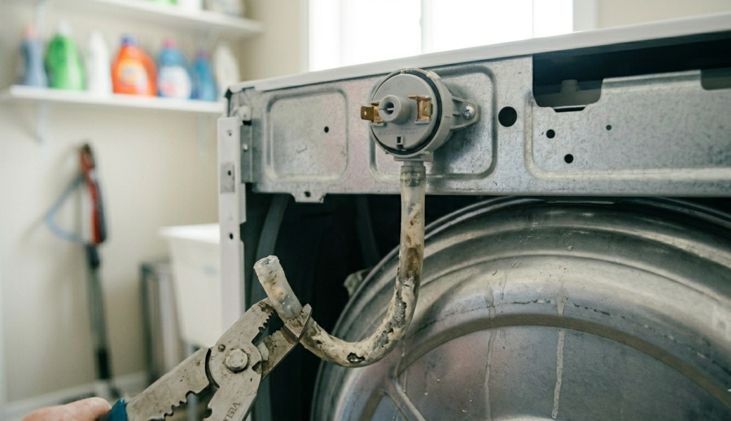 Modern washing machines don’t just guess when they’re full. A small plastic air tube and a physical pressure switch connect to the washing machine. When the drum fills with water, the air pushes the tube up and turns off the water. Heavy soap scum and minerals from hard water can mix to make a thick paste that blocks this tube. This trick makes your machine think it’s already full by giving it a false reading.